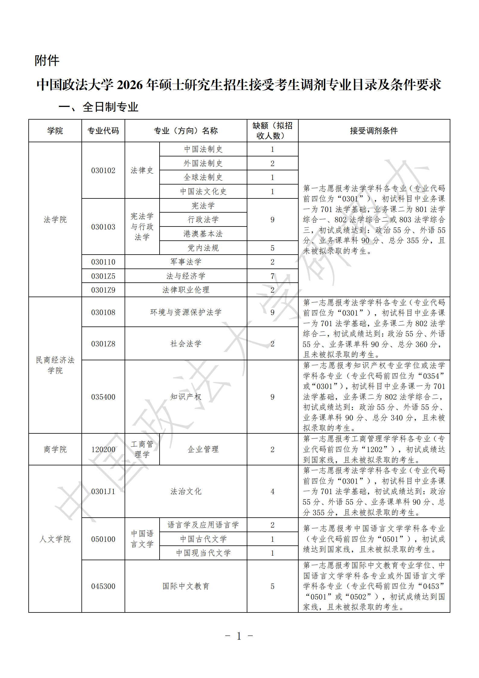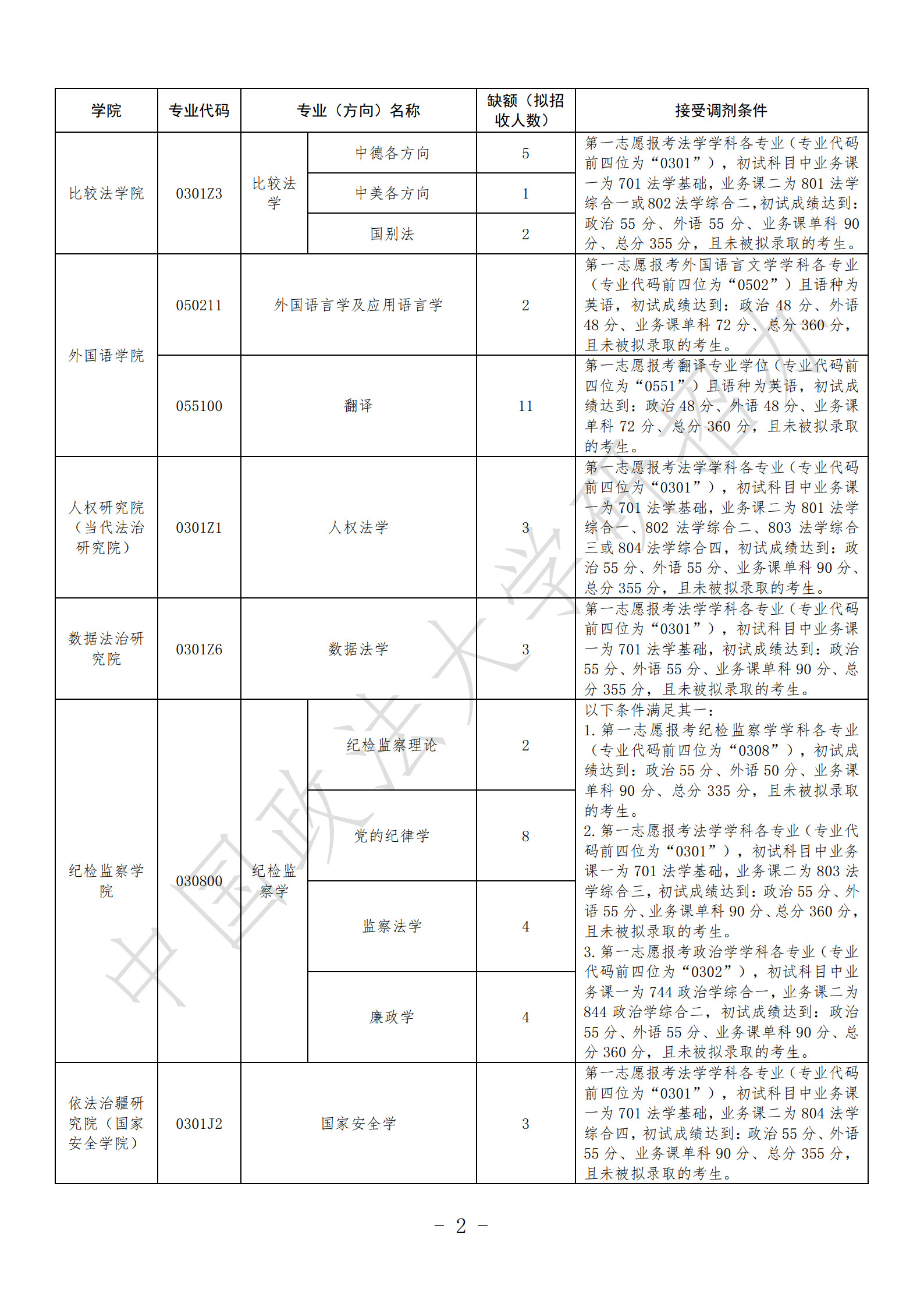 为做好我校2026年硕士研究生招生接受考生调剂工作,根据教育部《2026年全国硕士研究生招生工作管理规定》《关于做好2026年全国硕士研究生复试录取工作的通知》等文件精神,结合《中国政法大学2026年硕士研究生招生考试复试录取工作办法》和学校实际,制定本办法。 一、接受调剂专业目录及条件要求 我校接受调剂专业目录、缺额及接受调剂条件详见《中国政法大学2026年硕士研究生招生接受考生调剂专业目录及条件要求》(见附件)。 除特殊说明外,各专业不接受各类专项计划(包括单独考试、少数民族高层次骨干人才计划、援藏计划、退役大学生士兵计划)考生调剂。 申请调剂的考生除满足《中国政法大学2026年硕士研究生招生接受考生调剂专业目录及条件要求》外,还须符合《2026年全国硕士研究生招生工作管理规定》相关规定及我校《2026年硕士研究生招生章程》中规定的调入专业报考条件。 二、调剂复试比例 调剂复试采用差额形式,生源充足专业的复试比例一般不低于120%。各专业复试比例由各学院根据招生计划、申请调剂考生情况,结合往年调剂工作情况确定。 三、调剂工作程序 (一)考生网上填报调剂志愿 我校接受所有调剂考生(包括校内不同学院或专业之间考生调剂、报考外校调入我校、报考退役大学生士兵计划与普通计划之间调剂、报考全日制与非全日制之间调剂)均须通过“全国硕士生招生复试调剂服务系统”(以下简称“调剂系统”,4月8日0点开通)进行,严禁通过其他渠道接受考生调剂,或以“预调剂”“采集考生调剂意向”等为名变相开展调剂工作。 申请时间:工商管理(MBA)专业学位为4月8日0:00-12:00,其他专业为4月8日0:00-15:00。 申请网址:https://yz.chsi.com.cn/yztj 申请调剂的考生仅限填报我校一个学院一个专业的一个研究方向。同时填报我校多个志愿的,我校将以考生在调剂系统最后一次填报的志愿为准,其他志愿无效。 我校“非全日制”专业仅招收“定向就业”硕士研究生。对于申请调剂至“非全日制”专业的考生,如一志愿报考类别为“非定向就业”,我校将在录取前统一将录取类别修改为“定向就业”,考生须有可签订定向协议的就业单位方可被录取,并应按后续通知要求登录我校研究生招生平台填报定向就业单位等信息,在规定时间内签署定向就业协议。非全日制硕士研究生学习期间的学费、学制、奖学金、食宿等相关说明详见我校《2026年硕士研究生招生章程》。 申请享受初试加分的考生,若满足我校相关专业接受调剂条件,须在相关专业接受调剂申请结束时间之前,将本人有效居民身份证(正反面在同一页)、申请加分项相关证明材料提交至招生学院邮箱并电话联系学院进行确认(各学院邮箱及联系方式:点此查看)。 (二)招生学院遴选调剂复试名单 网上申请时间截止后,各学院将在满足申请条件的考生中,根据考生申请志愿、第一志愿专业、初试科目、初试成绩、专业背景、诚信情况等遴选进入复试的考生。对申请我校同一学院同一专业(或研究方向)、初试科目完全相同的调剂考生,我校将按考生初试成绩择优遴选进入复试的调剂考生名单。 各学院预计于4月9日前完成调剂复试名单遴选,并通过调剂系统向考生发送“复试通知”。“复试通知”中应注明考生确认复试通知的截止时间,未在规定时间内通过调剂系统确认接受我校调剂“复试通知”的考生,视为自愿放弃我校调剂复试资格,我校可取消其“复试通知”(即复试资格)。 (三)公布调剂复试名单 各学院确定调剂复试考生名单并报研招办审核通过后,按要求公布。调剂复试考生名单以各学院网站公布的名单为准。 (四)调剂复试 各学院根据本单位的调剂工作实施细则组织调剂考生复试,调剂复试安排经研招办审核通过后予以公布。 工商管理(MBA)专业学位调剂复试采用网络远程复试,于4月8日下午进行;其他专业采用现场复试,复试时间一般不早于4月10日。具体安排由复试学院制定并公布。 应用心理、工商管理(MBA)专业学位调剂复试考核方式为综合面试。应用心理专业学位综合面试包括专业课面试和外国语面试,工商管理(MBA)专业学位综合面试包括思想政治理论面试、专业课面试和外国语面试。以同等学力身份参加复试的考生,需在复试中进行加试,具体要求与安排由复试学院制定并公布。 进入调剂复试的考生应及时关注招生学院及研究生院网站调剂复试有关通知,按要求完成缴纳复试费、心理测试、提交复试资格审查材料等事项。对于进入我校2026年一志愿复试且缴纳过复试费的考生(一般为参加一志愿复试未获拟录取的考生),无需再次缴纳复试费;已完成心理测评的考生,无需再次参加测评。 (五)成绩计算 1.复试成绩计算 复试成绩满分为100分,其中复试各项成绩均按百分制折算,满分均为100分,计算公式一般为:复试成绩=专业课笔试成绩×30%+专业课面试成绩×50%+外国语面试成绩×20%。 报考应用心理专业学位考生的复试成绩=专业课面试成绩×80%+外国语面试成绩×20%。 报考工商管理专业学位考生的复试成绩=思想政治理论面试成绩×15%+专业课面试成绩×75%+外国语面试成绩×10%。 报考翻译专业学位考生的复试成绩=专业课笔试成绩×50%+专业课面试成绩×50%。 2.总成绩计算 总成绩满分为100分,计算公式为: 初试满分500分的,总成绩=初试总分÷5×50%+复试成绩×50%
