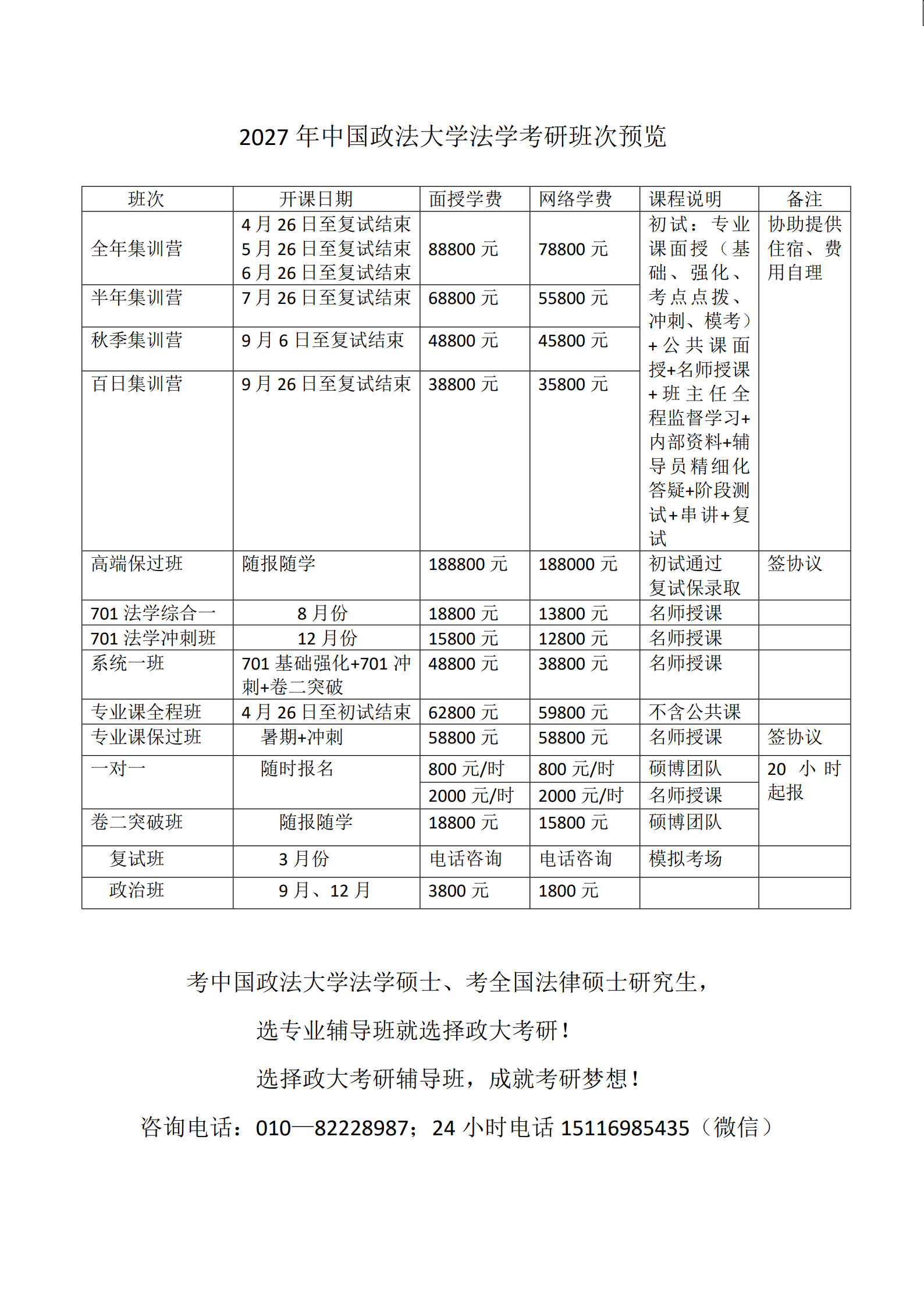 还等什么赶紧加入政大考研集训营,真正的小班教学,每班不超过20人,自己学无头绪,效率低,想一次性考上研究生的同学加入政大考研集训营,实现自己的考研梦想。机会只留给有远见的的人,抓住政大考研集训营给的机会,在这里有人管、有人监督你的学习,只要你有不怕吃苦的精神,和优秀的研究生在一起,你也会成为像他们一样优秀的人。政大考研集训营不仅开设专业课:宪法学、法理学、民事诉讼法学、民法学和刑法学,经济法、国际法、中国法制史等,还单独开设英语和政治辅导,只要是考研科目,一科不落每天保证十几个小时的高强度学习,只要你有勇气,那就来政大考研集训营。2025年7月11日,中国政法大学公布了关于调整2026年硕士研究生招生考试部分专业(方向)初试科目的通知,对法学学术学位专业课调整,变化很大,请2026年和2027年报考中国政法大学的考生多加关注。政大考研与时俱进,也将对授课内容进行调整,合理化安排授课。 咨询报名电话:010—82228987;微信同步15116985435